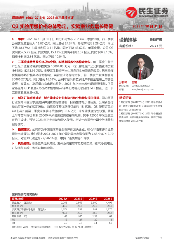 作为中国临床前安全性评价领域的龙头企业,昭衍新药的核心非临床评价业务保持市场领先地位。民生证券研究院预计公司2023-2025年归母净利润分别为7.53亿元、9.87亿元和12.70亿元,对应PE分别为27倍、20倍和16倍。基于此,维持公司“谨慎推荐”的投资评级。