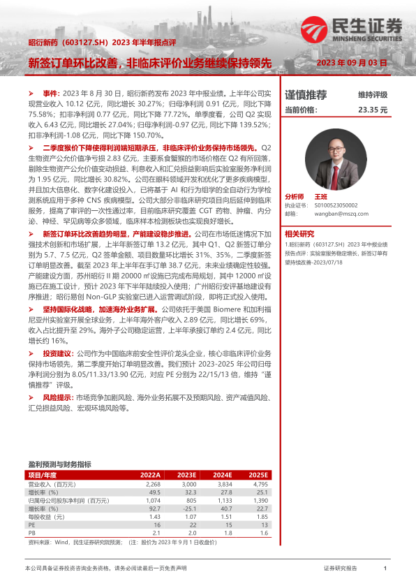 本报告对昭衍新药(603127.SH)2023年半年报进行了分析,核心观点如下: