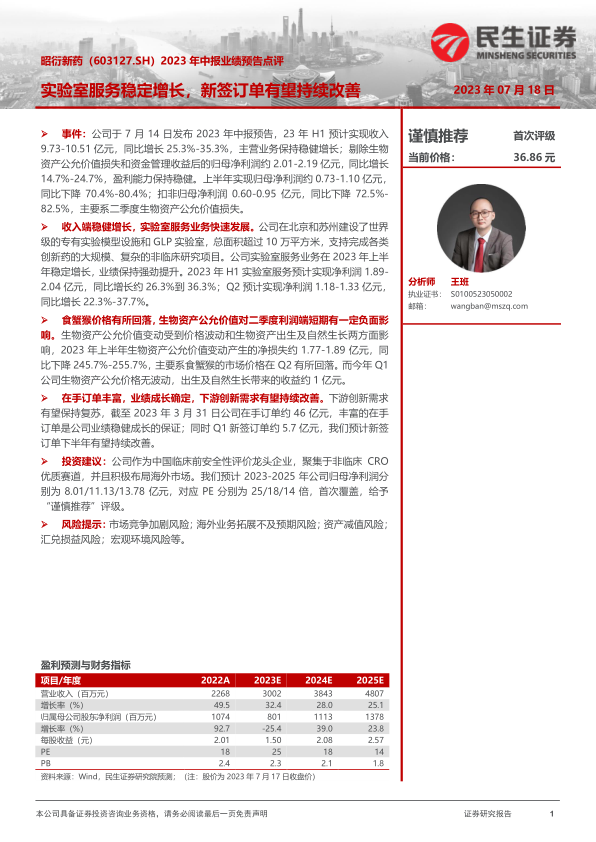 昭衍新药2023年中报业绩预告显示公司主营业务稳健增长,实验室服务业务表现强劲。虽然生物资产公允价值波动对利润端产生一定负面影响,但公司凭借充足的在手订单和下游创新需求的复苏,业绩成长确定性较高。民生证券首次覆盖,给予“谨慎推荐”评级,预计未来几年公司归母净利润将保持增长。