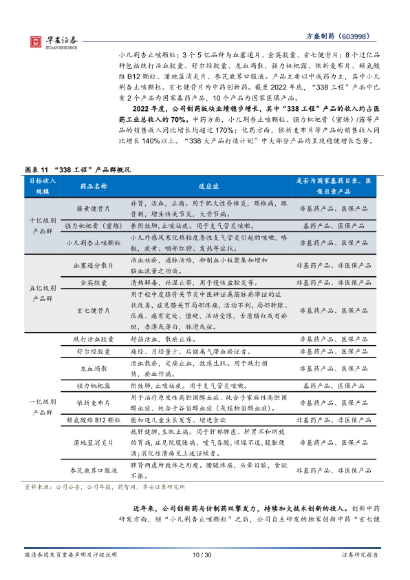 2021年,方盛制药打造了“338工程”产品集群,公司力争在未来5-10年时间内,打造3个10亿大产品、3个5亿大产品和8个超亿产品。其中3个10亿品种为藤黄健骨片、强力枇杷膏(蜜炼)、小儿荆杏止咳颗粒;3个5亿品种为血塞通片、金英胶囊、玄七健骨片;8个过亿品种包括跌打活血胶囊、舒尔经胶囊、龙血竭散、强力枇杷露、依折麦布片、赖氨酸维B12颗粒、蒲地蓝消炎片、参芪鹿茸口服液。产品主要以中成药为主,其中小儿荆杏止咳颗粒、玄七健骨片为中药创新药。截至2022年底,“338工程”产品中已有2个产品为国家基药产品,10个产品为国家医保产品。2022年度,公司制药板块业绩稳步增长,其中“338工程”产品的收入约占医药工业总收入的70%。