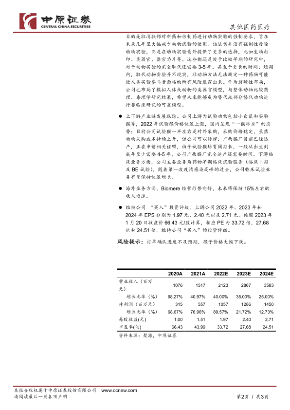 上下游产业链发展跟踪。公司上游为试验动物包括小白鼠和实验猴等,2022年试验猴价格快速上涨,国内呈现“一猴难求”的态势;目前公司试验猴一半左右是对外采购,采购价格稳定,虽然动物采购成本持续上升,但公司可以转嫁;广西猴厂目前已经达产,正在申请相关证照,由于试验猴培育周期长,一般从出生到成年至少需要4-5年,公司广西猴厂完全达产还需要时间。下游临床业务方面,公司主要业务为药物早期临床试验服务(临床Ⅰ期及BE试验),随着第一波疫情感染高峰的过去,公司临床试验业务有望保持快速增长。