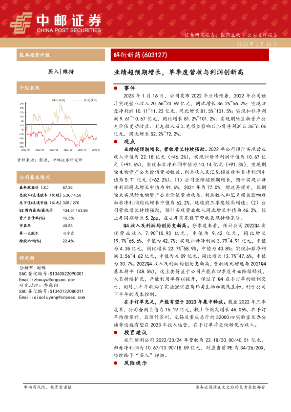 昭衍新药在2022年展现出卓越的业绩增长,营收和净利润均超预期,特别是第四季度创下历史新高。这一强劲表现得益于公司产能的有效释放、人员规模的扩大以及对成本的精细化管理。公司目前拥有充足的在手订单,并且随着2023年新增产能的集中投入运营,预计将进一步加速订单转化,支撑未来业绩的持续增长。尽管存在政策、产能投放和市场投融资等潜在风险,但鉴于其稳健的财务状况和显著的增长潜力,中邮证券维持对昭衍新药的“买入”评级。