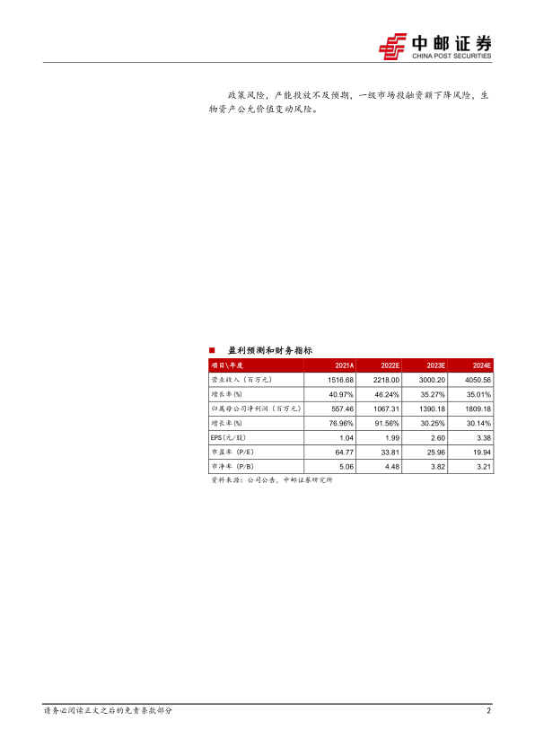 政策风险,产能投放不及预期,一级市场投融资额下降风险,生物资产公允价值变动风险。