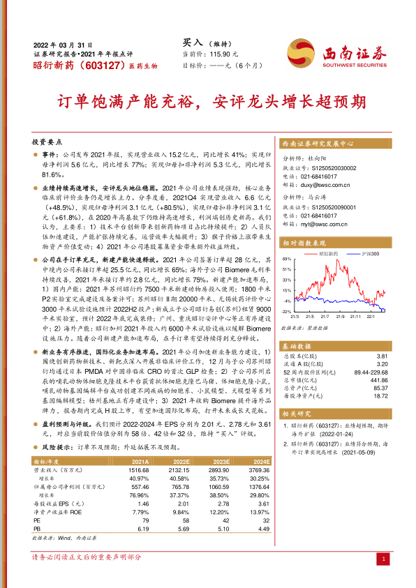 本报告对昭衍新药2021年年报进行了全面分析,认为公司业绩表现强劲,核心业务稳健增长,订单充足,产能扩张,新业务拓展和国际化布局均取得积极进展。维持“买入”评级,并提示了订单不及预期和外延拓展不及预期的风险。