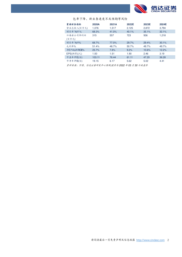 盈利预测与投资评级: 我们预计公司 2022-2024 年公司营业收入为21.25/28.72/37.94 亿元,同比增长 40.1%/35.1%/32.1%;归母净利润分别为 7.23/9.36/12.18 亿元,同比增长 29.7%/29.4%/30.1%,对应2022-2024 年 PE 分别为 61/47/36 倍。