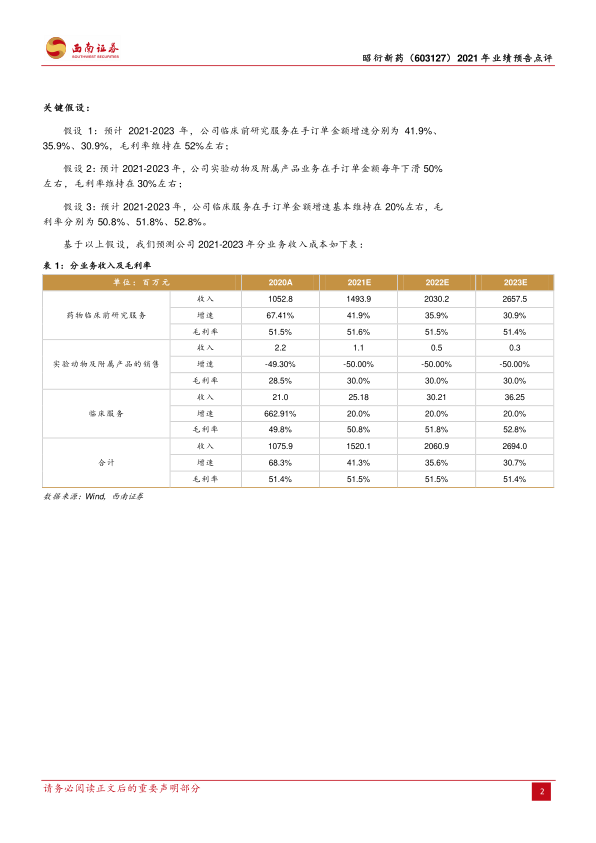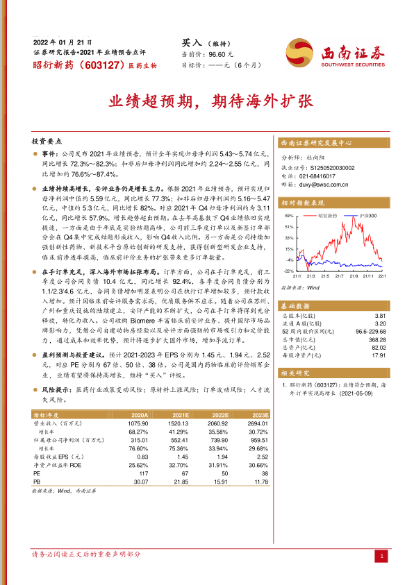本报告分析认为,昭衍新药2021年业绩超预期,主要受益于安评业务的持续高增长和在手订单的充足。公司积极拓展海外市场,未来增长潜力巨大。维持“买入”评级,但需关注医药行业政策变动、原材料上涨、订单波动和人才流失等风险。