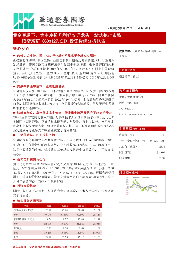 昭衍新药已铸就高壁垒,奠定行业龙头地位,并将在行业集中度不断提升的趋势中充分受益。公司具备全面的国际化GLP资质(包括中国NMPA、美国FDA、OECD、韩国MFDS、日本PMDA等),拥有超过2,700人的专业技术团队,并积累了丰富的药物评价经验。通过股权激励机制,公司有效绑定了管理层和核心员工利益。此外,公司积极拓展临床服务等新领域,完善一站式业务链条,预计将产生协同效应,进一步打开未来成长空间。基于对公司盈利能力的预测和多种估值模型分析,报告给予昭衍新药“强烈推荐(首次)”的投资评级,并设定六个月内目标价为60元/股。