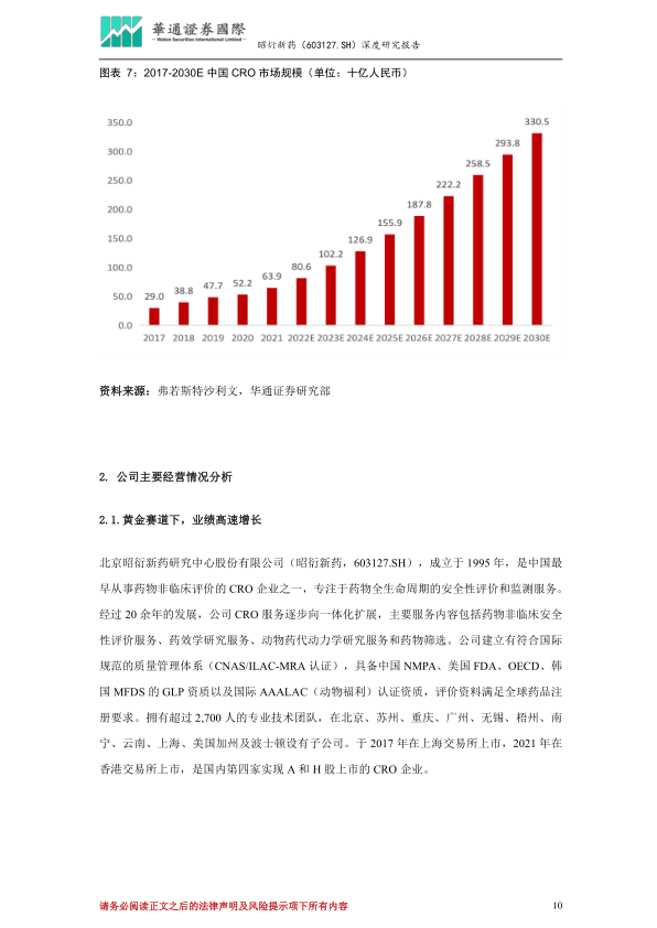 在国家政策的大力支持下,中国医药产业正加速向创新药转型,为合同研究组织(CRO)行业带来了前所未有的发展机遇。中国CRO市场规模增速显著高于全球平均水平,预计2022年至2030年将以20.03%的复合年增长率(CAGR)增长,到2030年达到3,305亿元。昭衍新药作为国内领先的CRO企业,凭借其在非临床安全性评价领域的深厚积累和一体化发展战略,业绩实现高速增长,营业收入和归母净利润在2017年至2022年期间分别增长7.5倍和14倍,复合增长率分别达49.77%和69.84%。