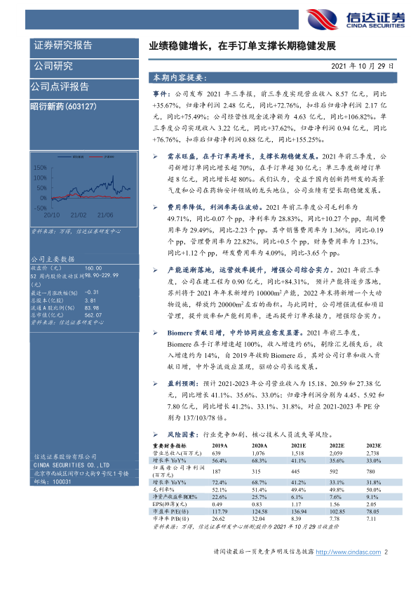 本报告分析了昭衍新药2021年三季报,指出公司业绩稳健增长,在手订单充足,支撑长期发展。同时,报告也分析了公司的盈利能力、产能扩张、运营效率以及国际业务的贡献。最后,报告给出了盈利预测和估值,并提示了相关风险。总体而言,昭衍新药受益于创新药研发的高景气度,未来发展潜力巨大。