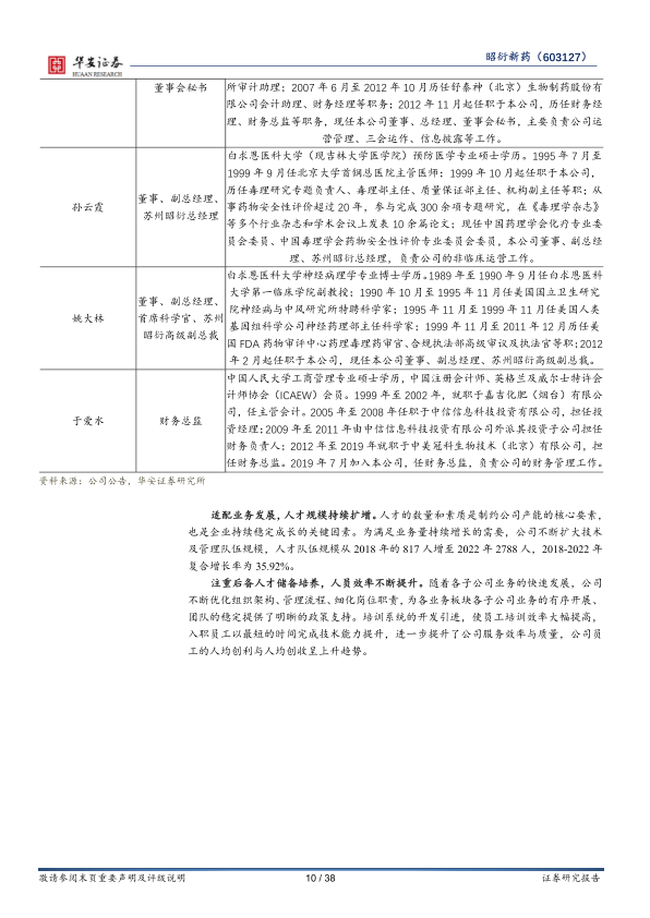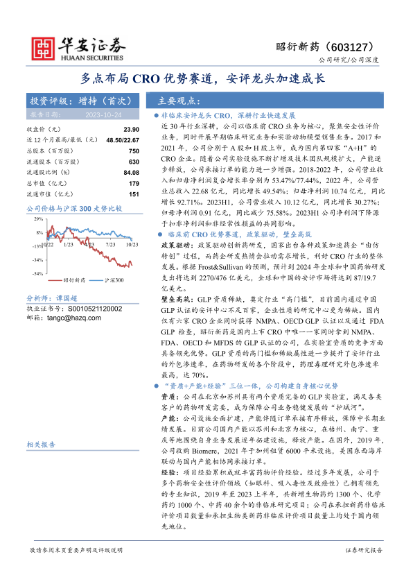 近 30 年行业深耕,公司以临床前 CRO 业务为核心,聚焦安全性评价业务,同时开展早期临床研究业务和实验动物模型销售业务。 2017 和2021 年,公司分别于 A 股和 H 股上市,成为国内第四家“ A+H”的CRO 企业。随着公司实验设施不断扩增及技术团队规模扩大,产能逐步释放,公司承接订单的能力进一步增强。 2018-2022 年,公司营业收入和归母净利润复合增长率分别为 53.47%/77.44%, 2022 年,公司营业总收入 22.68 亿元,同比增长 49.54%;归母净利润 10.74 亿元,同比增长 92.71%。 2023H1,公司营业收入 10.12 亿元,同比增长 30.27%;归母净利润 0.91 亿元,同比减少 75.58%。 2023H1 公司净利润下降源于扣非净利润和非经常性损益的共同影响。