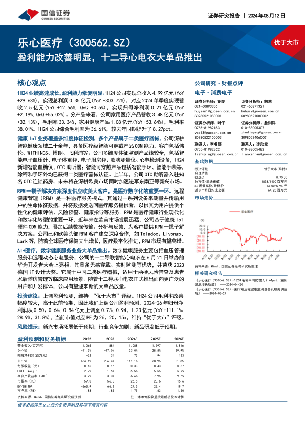 乐心医疗在2024年上半年实现了强劲的业绩反弹,总收入和总利润均实现高速增长,综合毛利率显著提升,显示出公司盈利能力的明显修复。公司凭借其在智能健康IoT领域的深厚积累,构建了全面的多维度体征检测产品线,并获得了多项二类医疗器械认证。通过为欧美头部客户提供远程健康管理(RPM)解决方案,公司深度参与全球医疗数字化进程。同时,十二导联智能心电衣作为AI+医疗领域的大单品推出,有望为公司带来新的增长动力。国信证券上调了公司未来三年的盈利预测,并维持“优于大市”的投资评级,反映了对公司未来增长潜力和市场前景的积极预期。尽管存在新兴市场拓展、行业竞争和新品研发等风险,但公司在智能健康领域的战略布局和创新能力有望支撑其持续发展。