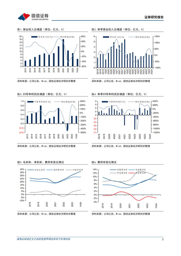 1H24业绩高速成长,盈利能力修复明显。1H24公司实现总收入4.99亿元(YoY+29.63%),实现总利润0.35亿元(YoY+303.72%),对应2Q24单季度实现营收2.5亿元(YoY+12.56%,QoQ+0.5%),实现归母净利润0.21亿元(YoY+2.19%,QoQ+55.02%)。分产品来看,公司家用医疗产品营收3.48亿元(YoY+32.13%),毛利率33.34%,家用健康产品1.08亿元(YoY+53.64%),毛利率38.01%。1H24公司综合毛利率为36.61%,较去年同期提升了8.27pct。