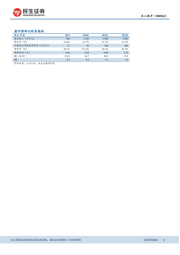 民生证券研究院预计乐心医疗2020年、2021年和2022年归母净利润分别为0.84亿元、1.6亿元和2.9亿元,对应当前股价的PE分别为55倍、29倍和16倍。考虑到公司股权激励业绩目标的高增长性,首次覆盖给予“推荐”评级。