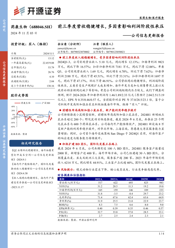 2024年前三季度,药康生物实现营业收入5.10亿元,同比增长12.13%,显示出收入端的稳健增长态势。然而,同期归母净利润为9821万元,同比下降16.57%;扣非归母净利润为7181万元,同比下滑12.06%。 具体到第三季度,公司实现营业收入1.69亿元,同比增长6.70%,但环比下滑7.62%;归母净利润2188万元,同比下滑45.51%,环比下滑53.31%;扣非归母净利润1697万元,同比下滑47.17%,环比下滑46.91%。 利润端承压的主要原因包括:生产规模扩大导致成本增加、海外市场开发力度加大导致销售费用上涨,以及政府补助金额同比减少。 基于利润端短期压力,开源证券下调了公司2024-2026年的归母净利润预测至1.46/1.89/2.33亿元(原预测为2.04/2.51/3.19亿元),对应EPS分别为0.35/0.46/0.57元。当前股价对应PE为37.0/28.5/23.1倍。尽管盈利预测下调,但鉴于公司在高附加值品系开发和海外市场拓展方面的积极努力,维持“买入”评级。