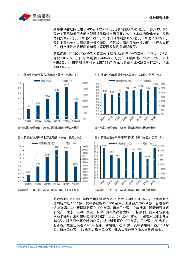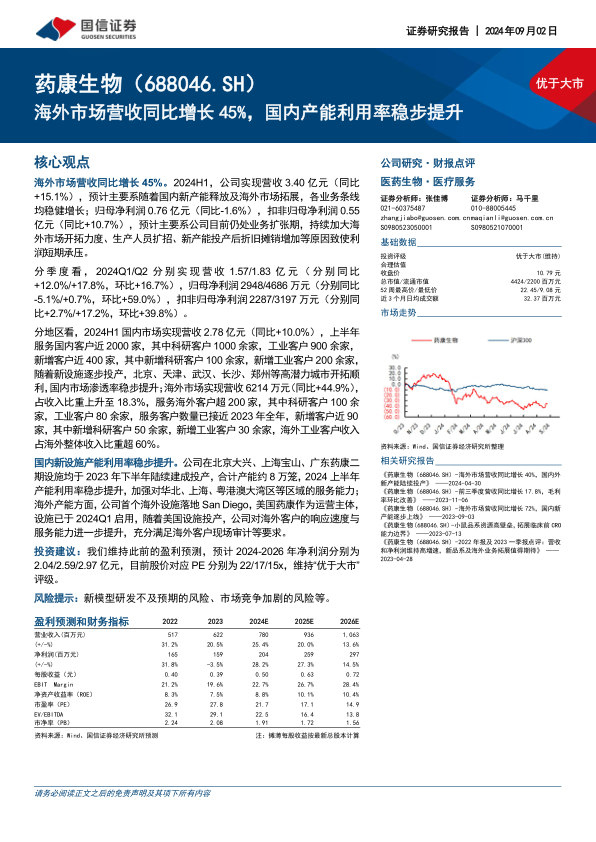 药康生物在2024年上半年展现出稳健的营收增长,尤其在海外市场实现了近45%的显著增长,海外收入占比提升至18.3%,成为公司业绩增长的重要驱动力。尽管因业务扩张和新产能投入导致短期利润承压,但扣非归母净利润仍保持增长,且国内外产能布局持续优化,国内新设施利用率稳步提升,海外首个设施也已投产,为公司未来发展奠定坚实基础。公司通过国内外市场协同拓展和产能优化,持续提升市场渗透率和服务能力。鉴于其稳健的增长前景和战略布局,国信证券维持“优于大市”的投资评级,并预计未来三年净利润将持续增长。