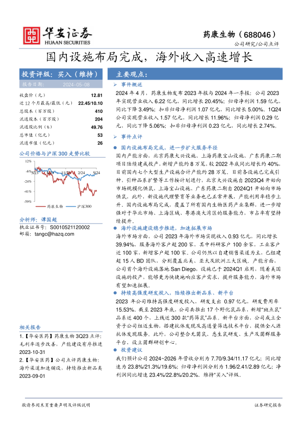 药康生物在2023年及2024年第一季度展现出稳健的营收增长,并通过完成国内设施布局和积极推进海外市场拓展,显著提升了服务能力和市场覆盖率。公司持续高强度的研发投入,不断推出新品系和新平台,为未来发展奠定坚实基础。尽管短期内归母净利润有所波动,但扣非归母净利润保持增长,且公司盈利能力和市场地位有望持续提升。