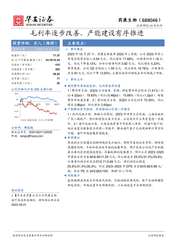 本报告分析了药康生物2023年三季报,认为公司通过有效的费用控制和产能扩张,盈利能力持续改善。国内外产能的有序释放将进一步推动公司增长,提升市场占有率。考虑到公司在模式动物领域的龙头地位和全球市场拓展布局,维持“买入”评级。同时,报告也提示了基因编辑技术迭代、实验动物管理、新产品研发、市场放量以及工业端恢复等风险。