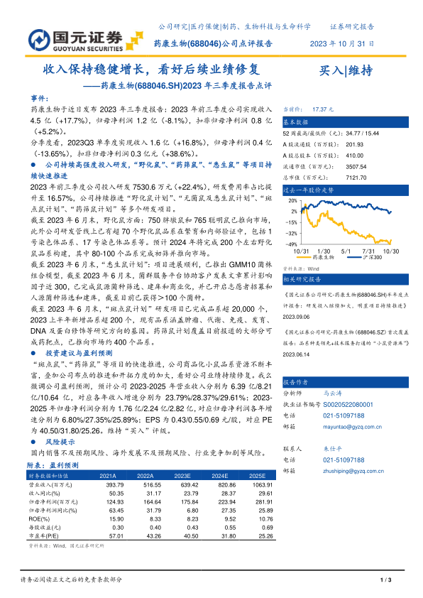 药康生物在2023年三季度保持了稳健的增长态势,同时持续加大研发投入,尤其在多个创新鼠品系项目上取得了积极进展。报告看好公司未来业绩的修复,并维持“买入”评级。然而,投资者也应关注报告中提及的各项风险,如国内销售、海外发展以及行业竞争等方面的不确定性。总体而言,药康生物作为国内领先的小鼠资源库,其持续的研发投入和市场拓展有望驱动公司业绩的长期增长。