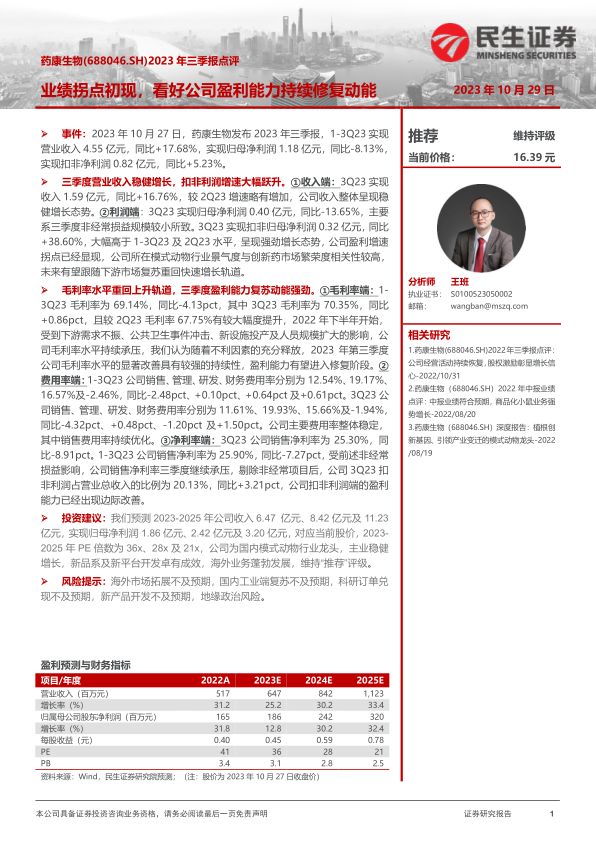 药康生物2023年三季报显示,公司营业收入保持稳健增长,扣非净利润增速大幅提升,盈利能力拐点显现。报告看好公司盈利能力持续修复的动能,认为随着不利因素的充分释放,公司毛利率水平的显著改善具有较强的持续性。