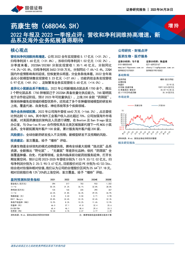 本报告对药康生物2022年年报及2023年一季报进行了深入分析,核心观点如下:
