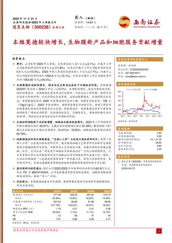本报告分析了冠昊生物2023年三季报,指出本维莫德的快速增长和生物材料新产品以及细胞技术服务的贡献是公司业绩增长的主要驱动力。公司在细胞领域的研发项目也在稳步推进,为未来发展奠定基础。维持“买入”评级,但同时也提示了相关风险。