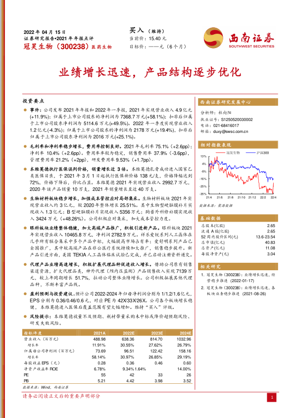 本报告对冠昊生物(300238)2021年年报和2022年一季报进行了分析,核心观点如下: