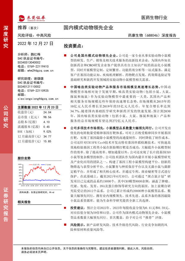 投资建议:预计公司2022年、2023年每股收益分别为0.41元和0.59元,对应估值分别为59倍和41倍。公司作为国内模式动物领先企业,小鼠模型品系数量大幅领先同行。首次覆盖,给予对公司“推荐”评级。