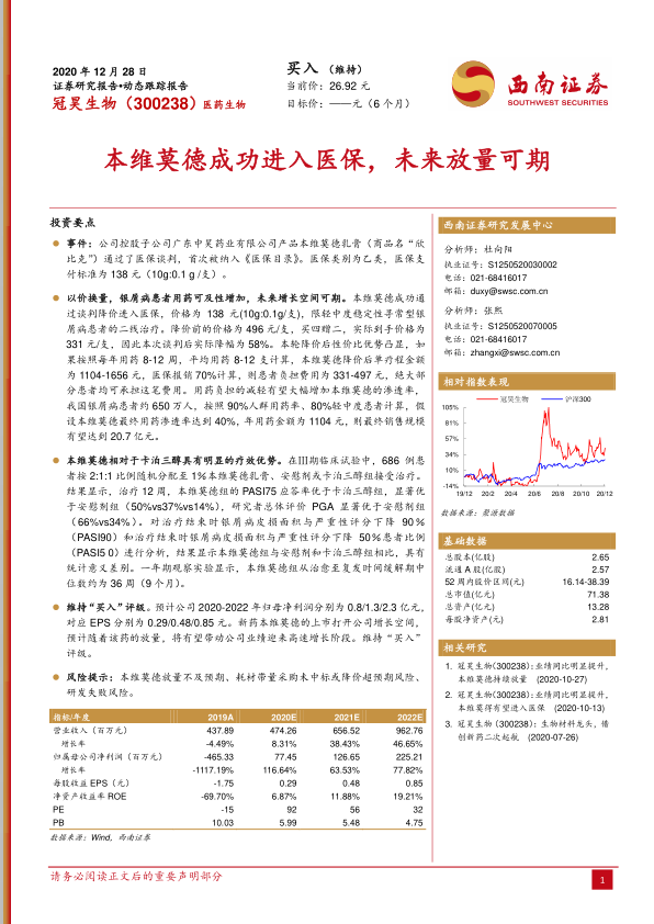 本报告分析了冠昊生物的本维莫德乳膏成功进入医保目录的影响,认为此举将显著提高药物的可及性,并有望大幅提升其市场渗透率和销售规模。同时,报告也强调了本维莫德相对于卡泊三醇的疗效优势。基于对公司未来业绩增长的乐观预期,维持对冠昊生物的“买入”评级,并提示了相关风险。