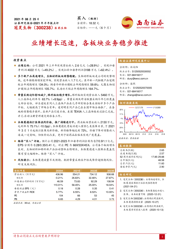 维持“买入”评级。预计公司2021-2023年归母净利润分别为0.7/0.9/1.1亿元,EPS分别为0.28/0.35/0.41元,对应PE为66X/53X/45X。公司各个板块增长良好,生物材料和眼科新产品拉动整体业绩增长,本维莫德进入医保后覆盖范围有望大幅增加。维持“买入”评级。