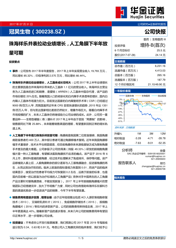 本报告的核心观点是,冠昊生物在2017年上半年通过珠海祥乐的并表实现了业绩的显著增长,尤其是在人工晶体业务方面。同时,人工角膜业务在下半年有望借助珠海祥乐的渠道优势实现放量增长。