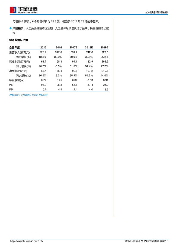 报告预测了公司未来三年的每股收益,并基于人工角膜的优异临床表现,给予公司“增持-B”评级,6个月目标价为25.5元,对应2017年75倍的市盈率。但同时也提示了人工角膜销售不达预期、人工晶体增长低于预期以及销售费用增长过快的风险。