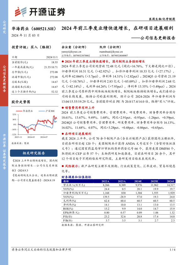2024年前三季度公司实现营收72.48亿元(同比+16.76%,下文都是同比口径),归母净利润10.31亿元(+42.92%),扣非归母净利润10.33亿元(+27.17%),毛利率62.066%(+3.7pct),净利率14.31%(+2.82pct)。2024Q3公司营收21.19亿元(+10.76%),归母净利润2.83亿元(+85.09%),扣非归母净利润2.68亿元(+82.14%),毛利率64.26%(+7.93pct),净利率13.35%(+5.49pct)。2024前三季度公司原料药中间体板块较快增长,制剂板块维持较快增长。我们看好公司的长期发展,维持公司的盈利预测,预计公司2024-2026年归母净利润为13.04/15.55/19.29亿元,当前股价对应PE为20.8/17.4/14.0倍,维持“买入”评级。