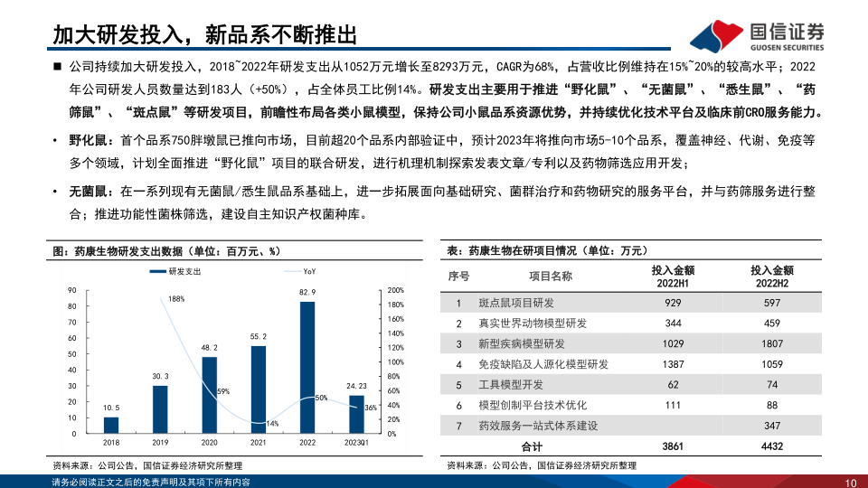 基于商品化小鼠产品,布局“一站式”临床前CRO服务。商品化小鼠模型是公司的核心业务,2022年实现营收3.23亿元(+27.6%),收入占比62.7%;公司现有“斑点鼠”品系超过2万个,全面覆盖肿瘤、代谢、免疫、发育、DNA及蛋白修饰等科研方向;免疫缺陷NCG及衍生品系授权CharlesRiver北美独家代理,产品力得到海外巨头背书;启动“无菌鼠”和“野化鼠”等特色项目,新品系将陆续推向市场,有望重塑行业格局。功能药效是公司的高成长业务,2022年实现营收0.97亿元(+81.5%),“药筛鼠”计划推出500余个新品系,进一步提升药物筛选服务能力;推出全人源抗体药物发现NeoMab小鼠模型,完善临床前CRO业务布局。