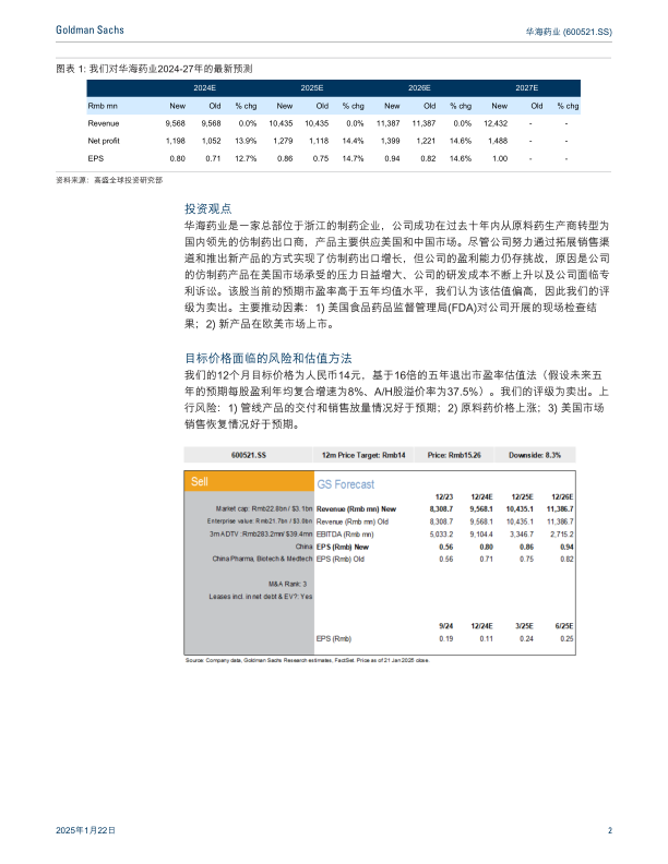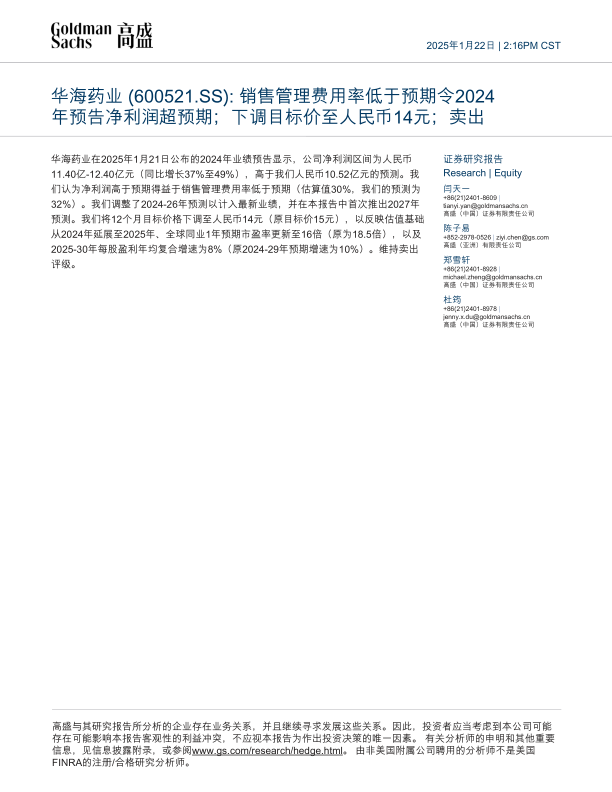 本报告核心观点是,华海药业2024年业绩预告净利润超预期,主要得益于销售管理费用率低于预期。尽管如此,高盛仍下调了华海药业的目标价,并维持“卖出”评级。