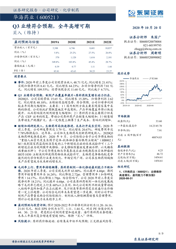 华海药业2020年前三季度业绩表现强劲,符合预期,全年高增长可期。公司通过制剂产品市场覆盖率的提升、原料药业务的恢复以及持续的研发投入,实现了业绩的显著增长。尤其在生物药领域的布局,为公司未来的发展打开了新的增长空间。同时,公司毛利率的提升和费用率的有效控制,进一步增强了盈利能力。维持“买入”评级,但需关注原料药价格波动、集采中标情况以及汇兑损益风险。