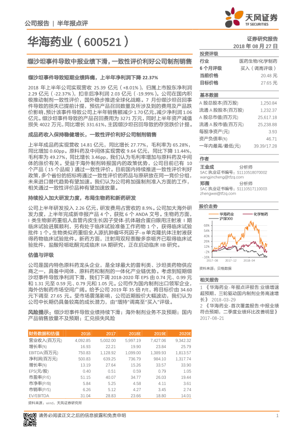 考虑到短期缬沙坦事件导致净利润下滑,下调2018-2020年EPS至0.59元、0.79元和1.05元。给予公司2019年35倍P/E,将目标价下调至27.65元。将评级由“增持”调高至“买入”。