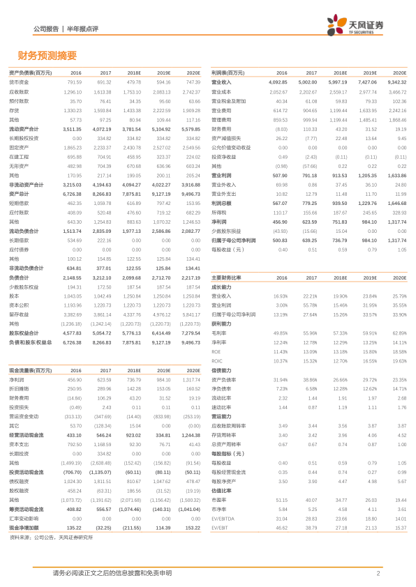 上半年成品药实现营收14.81亿元,同比增长27.77%,毛利率为65.28%,同比增加0.60pp。原料药及中间体实现营收9.64亿元,同比下降11.44%,毛利率为49.27%,同比增长3.46pp。 公司已有10个产品(15个品规)通过一致性评价。国内持续推进一致性评价利好政策,多个省份的招标将通过一致性评价的药品与原研放在同一竞价分组,未来进口替代趋势有望加速。