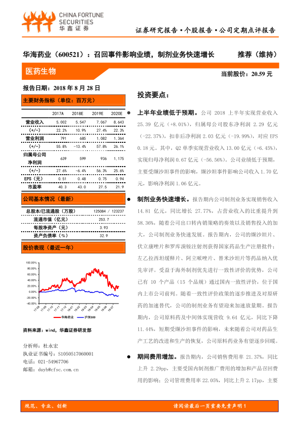 本报告分析了华海药业2018年上半年的业绩情况,指出业绩受到缬沙坦召回事件的负面影响,但制剂业务保持快速增长势头。报告还分析了期间费用增加的原因,并下调了公司盈利预测,维持“推荐”评级,同时提示了相关风险。总体而言,华海药业短期业绩受挫,但长期发展潜力依然存在,尤其是在制剂业务方面。