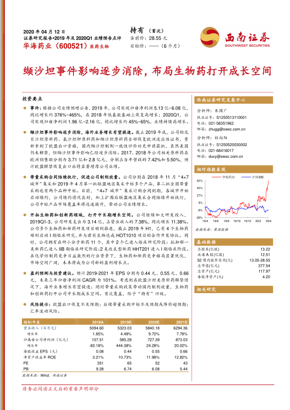 缬沙坦事件影响逐步消除,布局生物药打开成长空间