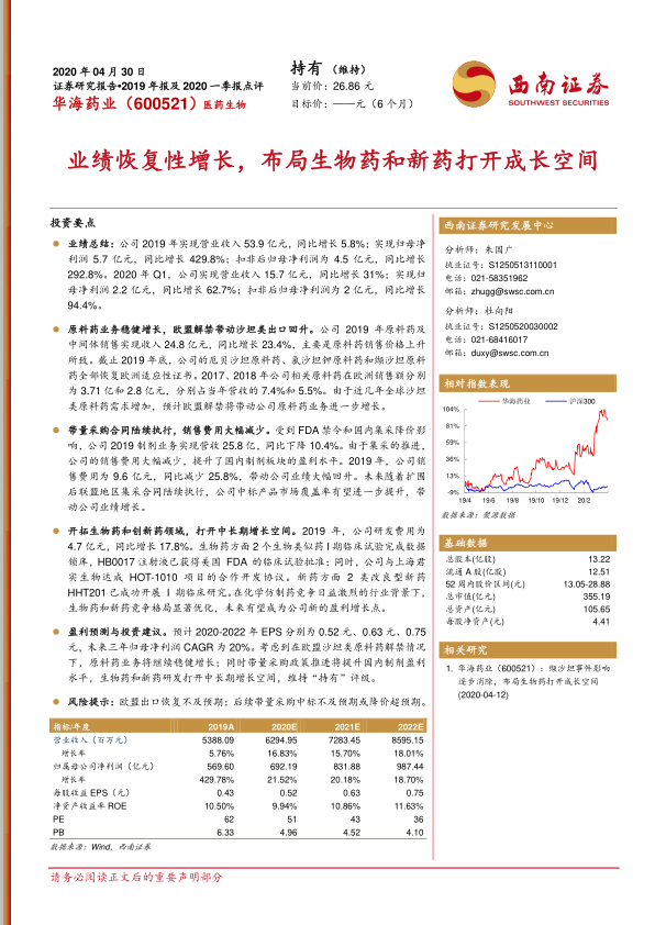考虑到华海药业作为原料药龙头企业的地位,其全球化布局以及中间体、原料药、制剂一体化的核心优势日益凸显。在欧盟沙坦类原料药解禁的有利情况下,原料药业务有望持续稳健增长;同时,带量采购政策的推进将有效提升国内制剂业务的盈利水平;此外,生物药和新药研发的积极进展将为公司打开中长期的成长空间。基于这些积极因素,我们维持对华海药业的“持有”评级。