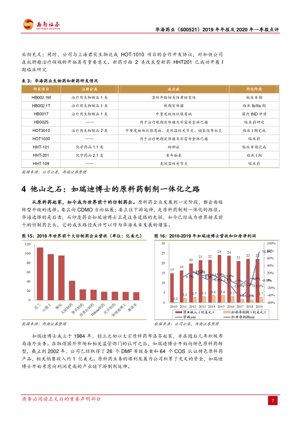 公司正加快推进生物药和新药项目研发,以打开中长期增长空间。华海药业依托其庞大的研发队伍和多年在仿制药领域积累的经验,积极进军生物药和创新药研发领域。目前,公司已有2个生物类似药完成I期临床试验数据锁库,HB0017注射液已获得美国FDA的临床试验批准,发展后劲充足。同时,公司与上海君实生物达成HOT-1010项目的合作开发协议,这对加快公司在抗肿瘤治疗领域的开拓具有重要意义。在新药方面,2类改良型新药HHT201已成功开展I期临床研究。在化学仿制药竞争日益激烈的行业背景下,生物药和新药的竞争格局显著优化,未来有望成为公司新的盈利增长点。