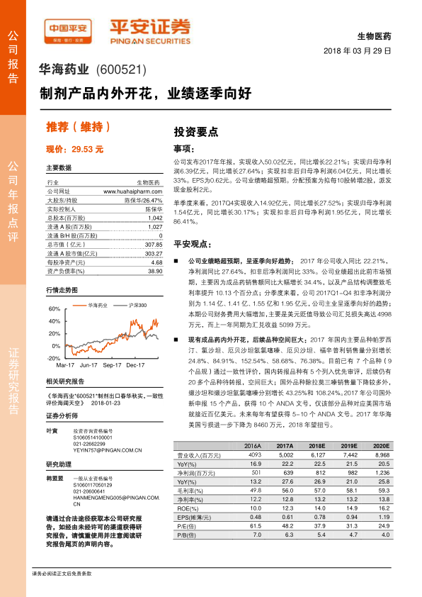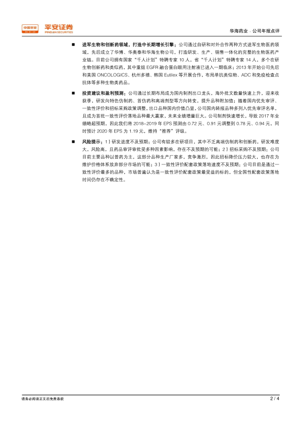 华海药业2017年业绩超出预期,得益于制剂产品在国内外市场的良好表现。公司积极布局生物医药和创新药领域,通过自研和对外合作,构建完整产业链,为未来的增长奠定基础。尽管面临研发、招标采购和政策落地等风险,但考虑到公司在制剂出口和国内市场一致性评价方面的优势,以及未来的增长潜力,维持“推荐”评级。