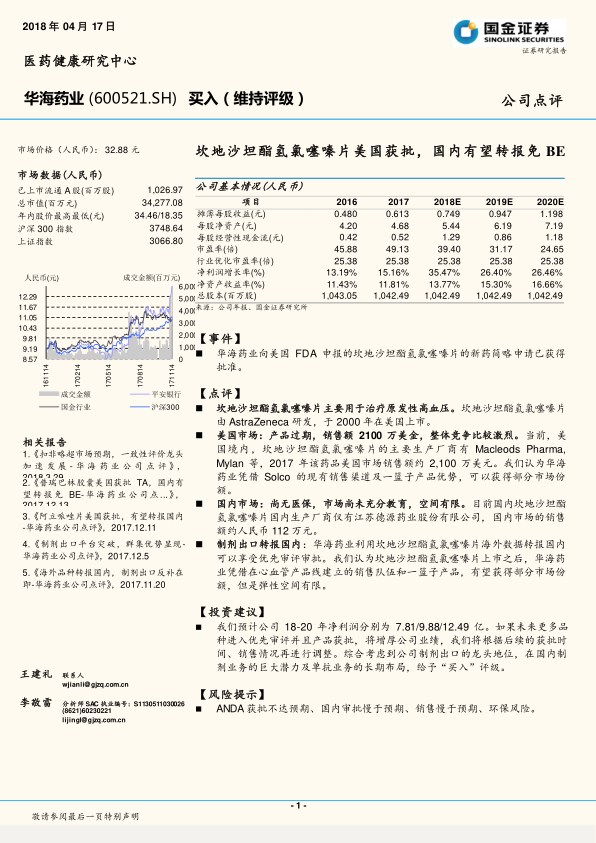 本报告分析了华海药业坎地沙坦酯氢氯噻嗪片在美国获批的影响,强调了公司作为一致性评价龙头企业的地位和未来发展潜力。报告指出,华海药业凭借Solco的销售渠道和产品优势,有望在美国市场获得一定份额;同时,利用海外数据转报国内可享受优先审批,上市后有望凭借心血管产品线优势获得部分市场份额。公司应强化销售,保证产品上市后放量,并持续受益于一致性评价政策红利。此外,报告还分析了华海药业在全球仿制药竞争中的优势,以及在中长期对抗体、免疫治疗领域的布局。综合考虑公司制剂出口的龙头地位、国内制剂业务的巨大潜力及单抗业务的长期布局,维持“买入”评级。