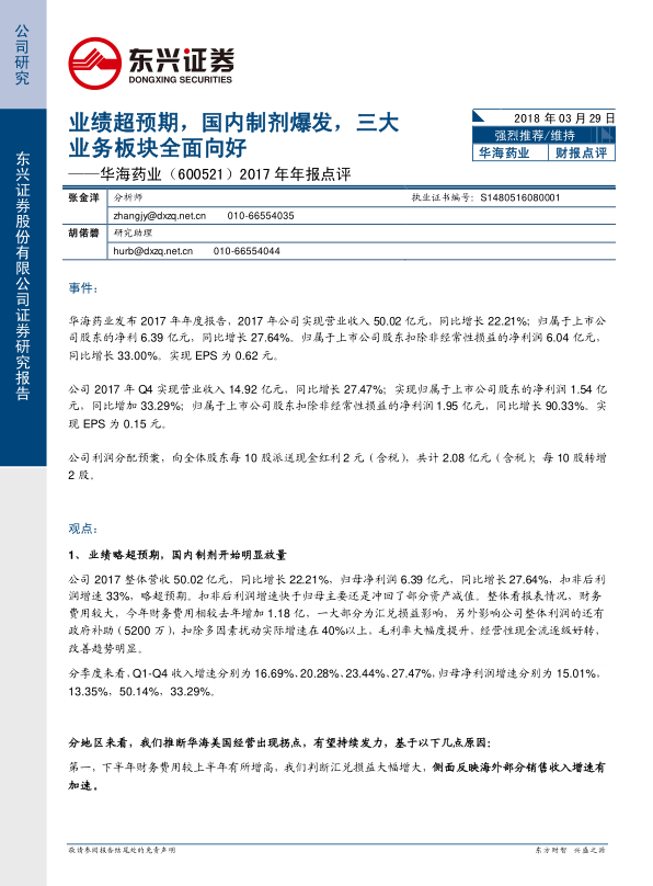 本报告的核心观点是华海药业2017年业绩超预期,主要得益于国内制剂业务的爆发和三大业务板块的全面向好。展望未来,公司有望维持高速增长,制剂出口、国内市场拓展和原料药涨价将成为主要增长动力。