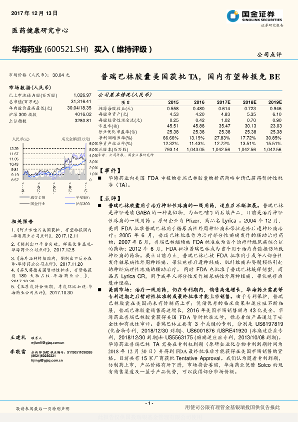- 华海药业向美国FDA申报的普瑞巴林胶囊的新药简略申请已获得暂时性批准(TA)。