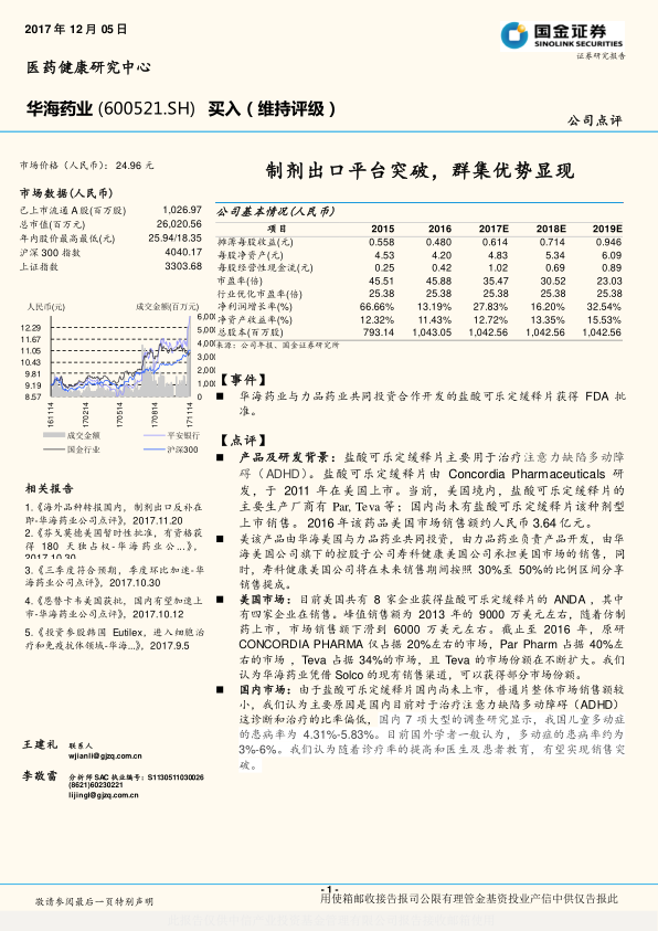本报告分析了华海药业盐酸可乐定缓释片获 FDA 批准的事件,并深入探讨了公司制剂出口平台、国内制剂业务、原料药和生物药业务的投资逻辑。报告认为,华海药业通过“中国制造+美国渠道”的双赢模式,有望抢占美国仿制药市场份额,国内制剂业务也具备巨大潜力。维持“买入”评级,但需关注 ANDA 获批、国内审批、销售和环保等风险。