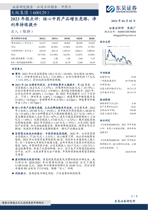 考虑到医药政策及消费环境的不确定性,东吴证券将公司2024-2025年归母净利润预测分别下调至11.04亿元和14.46亿元(原预测为13.30亿元和18.05亿元),并预计2026年归母净利润为18.09亿元。对应当前市值的PE分别为17倍、13倍和10倍。维持“买入”评级。