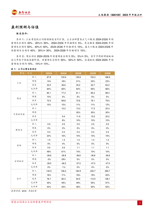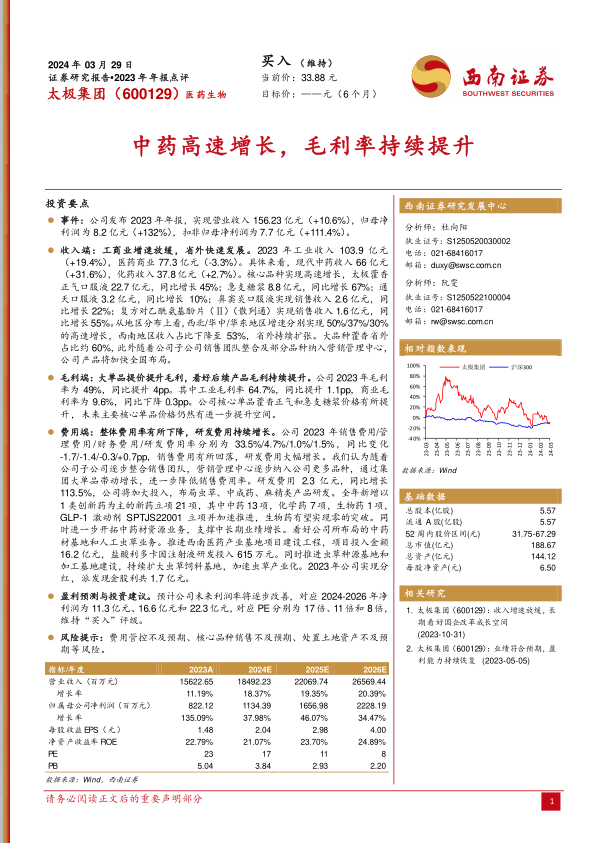 太极集团2023年年报显示,公司在现代中药业务的强劲增长和省外市场的成功扩张驱动下,实现了营业收入和归母净利润的显著提升,特别是归母净利润同比增长132%。核心大品种如藿香正气口服液和急支糖浆表现突出,带动整体毛利率持续改善。公司大幅增加研发投入,积极布局创新药和中药材资源,为未来多元化增长奠定基础。尽管医药商业收入略有下降,但通过销售团队整合和营销效率提升,公司有望进一步优化费用结构。分析师维持“买入”评级,预测公司未来三年净利润将持续高速增长,并指出其当前估值相较同行业可比公司具有明显优势,具备长期成长空间。投资者需关注费用管控、核心品种销售及土地资产处置等潜在风险。