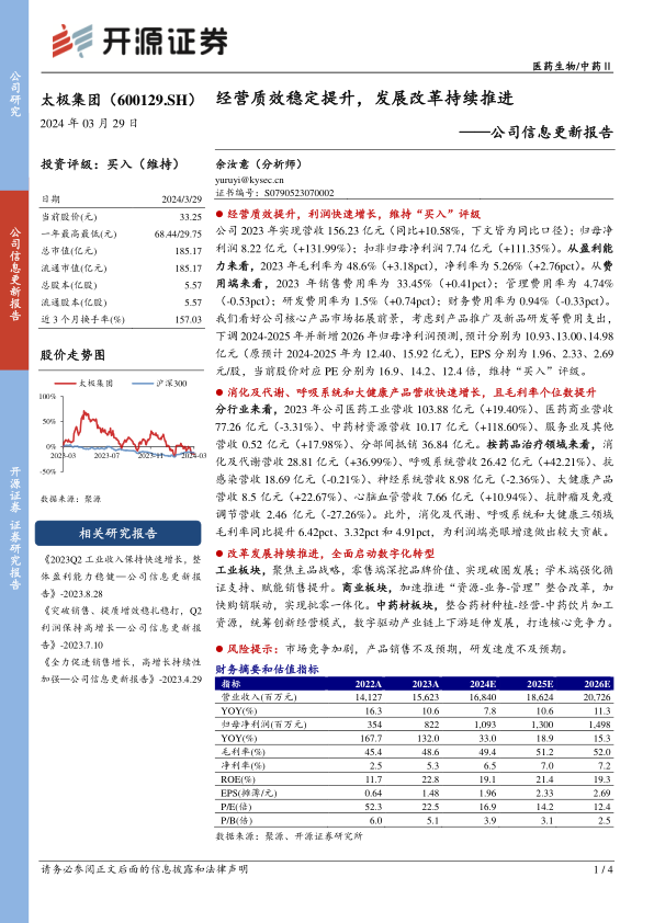 2023年,太极集团的财务表现强劲,营业收入达到156.23亿元,同比增长10.58%。归属于母公司股东的净利润为8.22亿元,同比大幅增长131.99%;扣除非经常性损益后的归母净利润为7.74亿元,同比增长111.35%。在盈利能力方面,公司毛利率提升3.18个百分点至48.6%,净利率提升2.76个百分点至5.26%。费用端管理亦显成效,管理费用率下降0.53个百分点至4.74%,财务费用率下降0.33个百分点至0.94%,而研发费用率则提升0.74个百分点至1.5%,显示公司在研发投入上的增加。基于此,开源证券下调了2024-2025年并新增2026年归母净利润预测,预计分别为10.93亿元、13.00亿元和14.98亿元,对应EPS分别为1.96元/股、2.33元/股和2.69元/股,当前股价对应PE分别为16.9倍、14.2倍和12.4倍,维持“买入”评级。