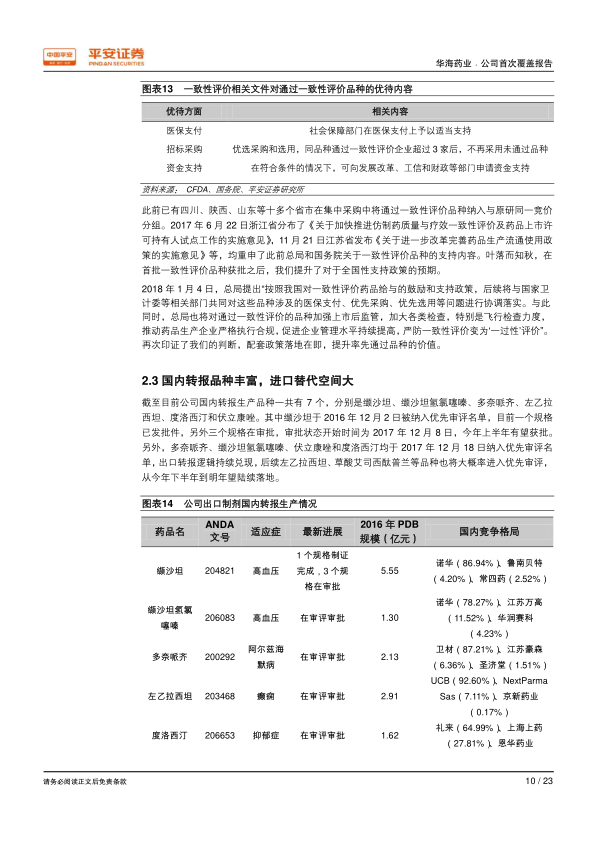 - 政策利好加速出口制剂回归: 随着国内药品审评审批政策与欧美接轨,在欧美规范市场获批的制剂品种回国后将享受优先审评、一致性评价和招标采购等多环节优待。华海药业拥有20多个海外制剂品种,将成为这些政策的最大受益者之一。通过一致性评价的品种将获得医保支付支持、医疗机构优先采购,并在同品种通过企业超过3家时,未通过品种将不再被集中采购。